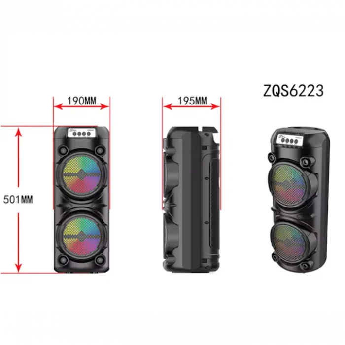 Boxa portabila ZQS6223 ofera un sunet puternic si clar datorita subwooferului de 6 inch si puterii de 120W PMPO. Luminile LED RGB sincronizate cu muzica creeaza atmosfera perfecta pentru petreceri, karaoke sau evenimente.